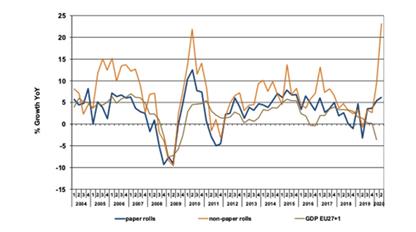 按照Finat最新一期Radar報(bào)告的初步結(jié)果,經(jīng)過(guò)兩年溫和的發(fā)展(2018年和2019年的年需求增長(zhǎng)為1.5%),Covid-19大流行已經(jīng)大大增加了歐洲在2020年上半年對(duì)不干膠標(biāo)簽材料的需求。