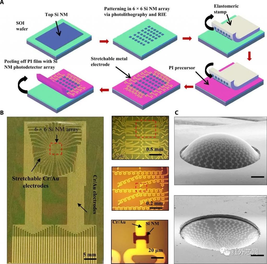 為了證明SWIR成像能力,該團隊在薄聚合物基板上的超薄硅納米膜上制造了金屬-半導體-金屬(MSM)型光電探測器陣列。該陣列幫助激光雷達傳感器和生物啟發(fā)成像系統(tǒng)實現(xiàn)了成像技術(shù)。研究者使用光刻技術(shù)對光電二極管陣列矩陣進行了構(gòu)建,然后將構(gòu)建體轉(zhuǎn)移到聚酰亞胺(PI)膜上,并增加了樣品架腔內(nèi)壓力,使PI膜凸出并形成凹凸形狀,同時保持了所制造的陣列。然后研究者使用拉曼光譜法測量了不同厚度的硅納米膜的最大應(yīng)變值。研究者還計算了10納米厚的硅納米膜在0 ~ 4%不同施加的雙軸應(yīng)變值下的能帶圖,以了解帶隙減小在SWIR光檢測中的作用。